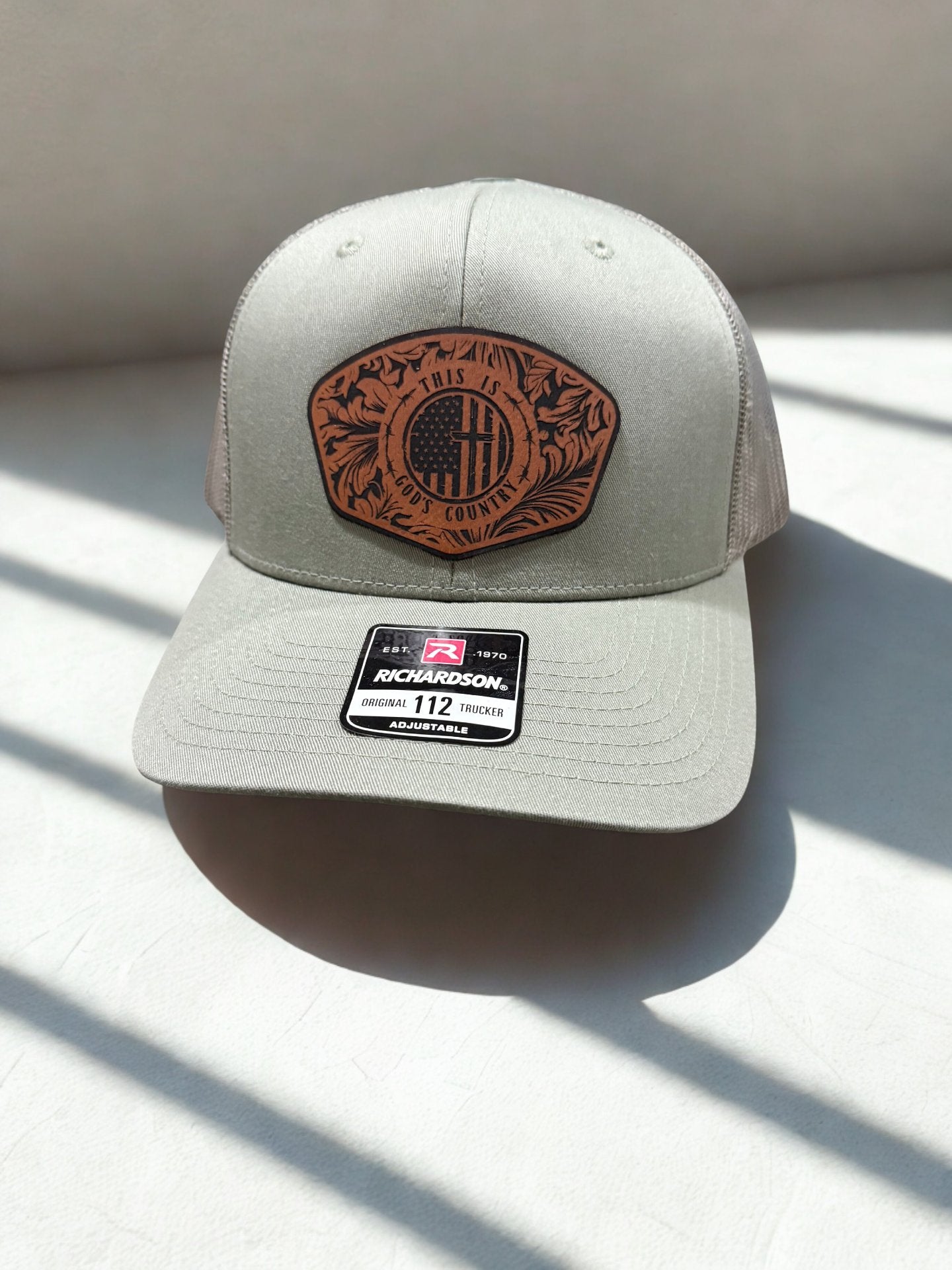 Stay stylish and connected to your faith with the God's Country hat. The leatherette patch adds a touch of sophistication to this classic design. Embrace the peaceful and beautiful outdoors while showing off your love for God.